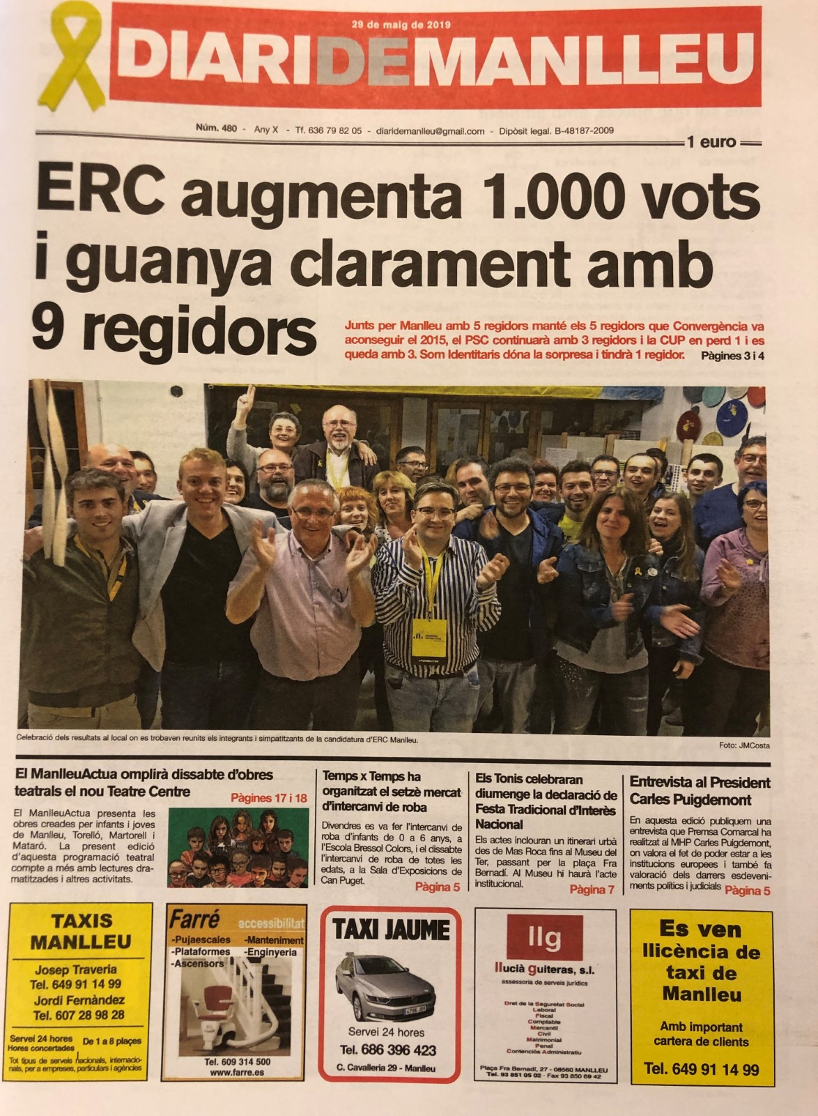 Aquesta és la portada del "Diari de Manlleu" d'avui dimecres, 29 de maig del 2019.
