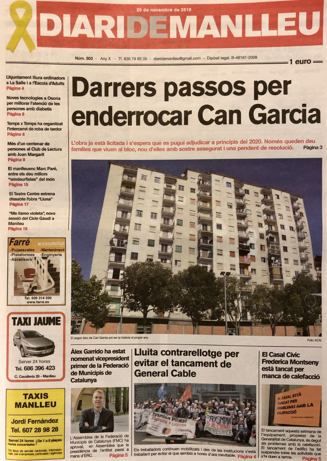 Aquesta és la portada del "Diari de Manlleu" d'avui dimecres, 20 de novembre del 2019.
