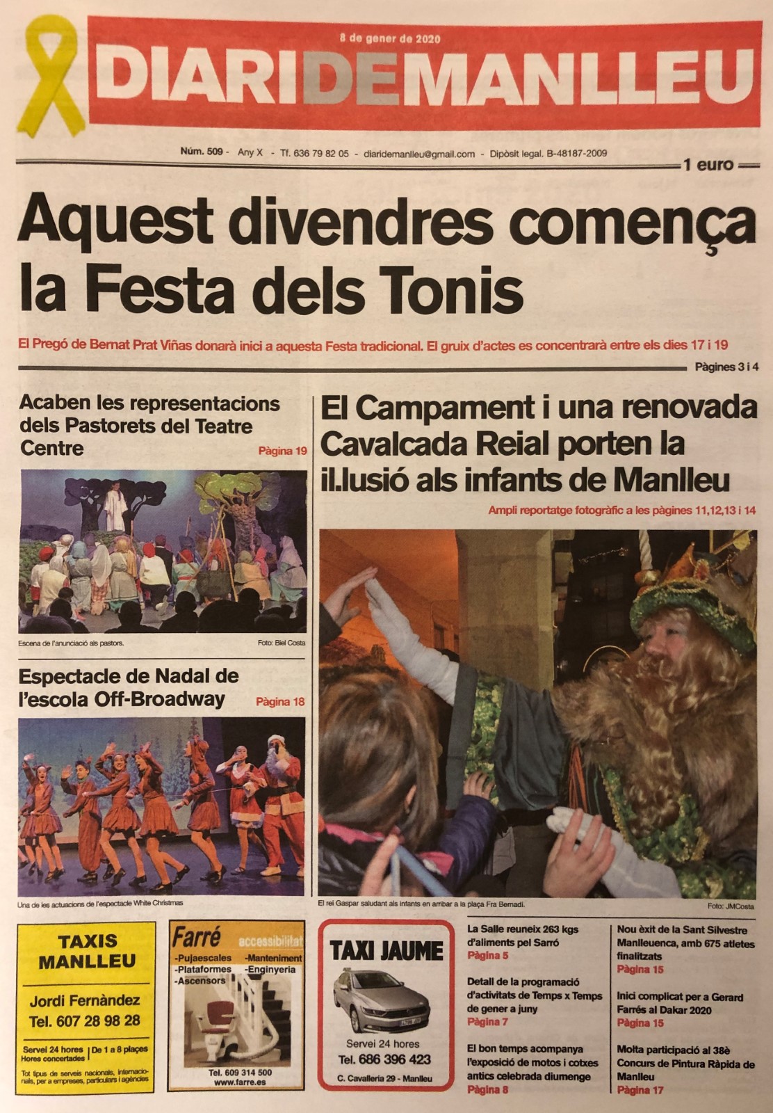 Aquesta és la portada del "Diari de Manlleu" d'avui dimecres, 8 de gener del 2020.