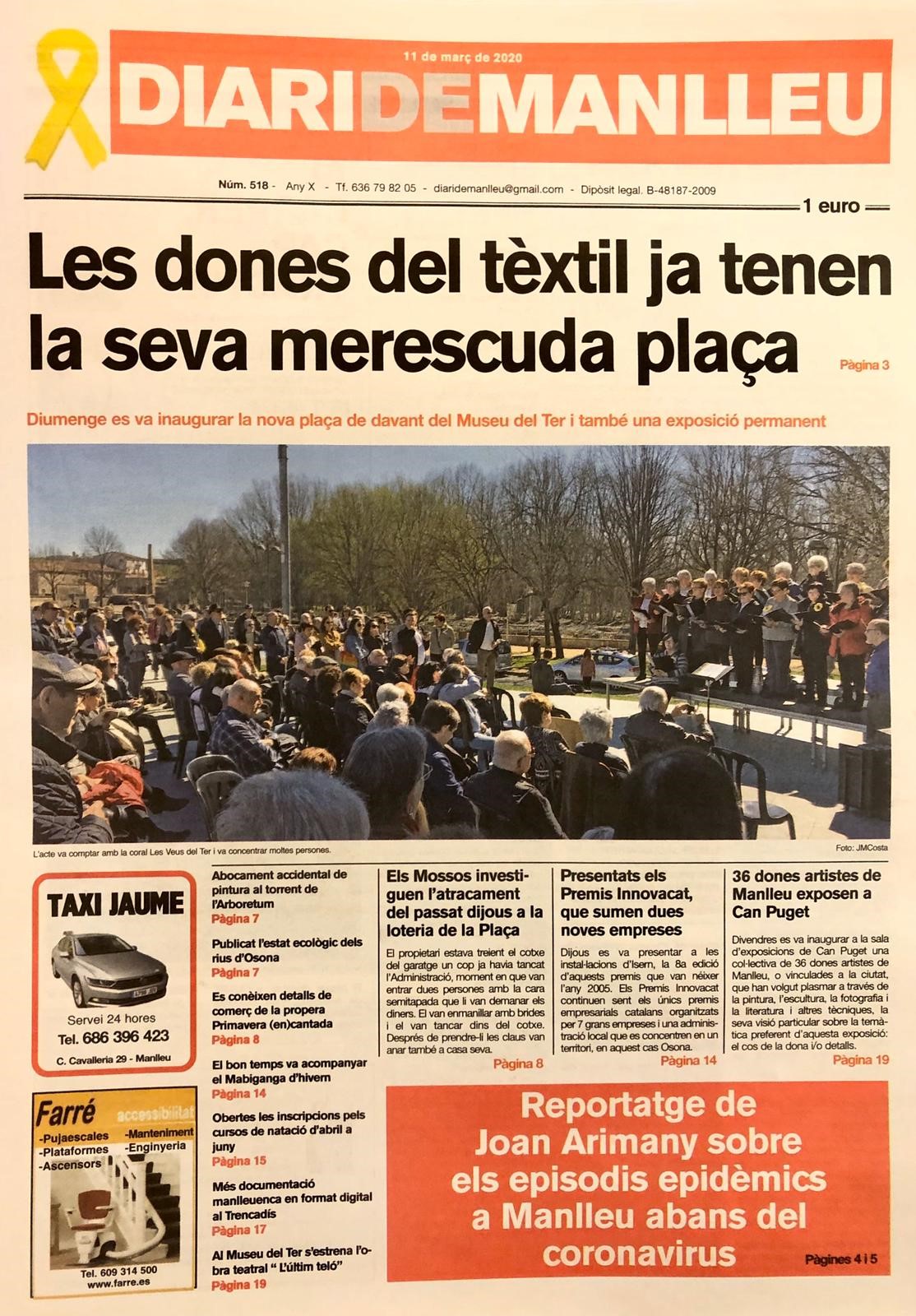 Aquesta és la portada del "Diari de Manlleu" d'avui dimecres, 11 de març del 2020.