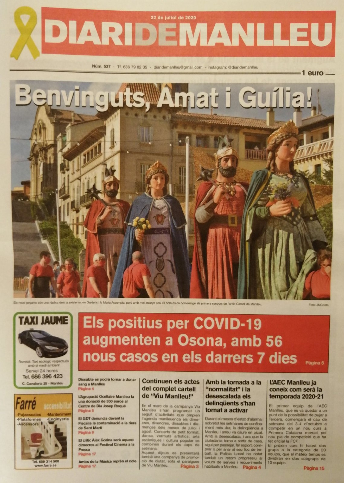 Aquesta és la portada del "Diari de Manlleu" d'avui dimecres, 22 de juliol del 2020.