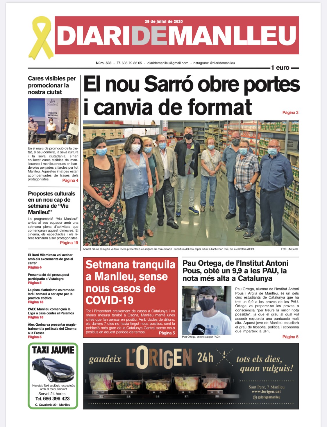 Aquesta és la portada del “Diari de Manlleu” d’avui dimecres, 29 de juliol del 2020.