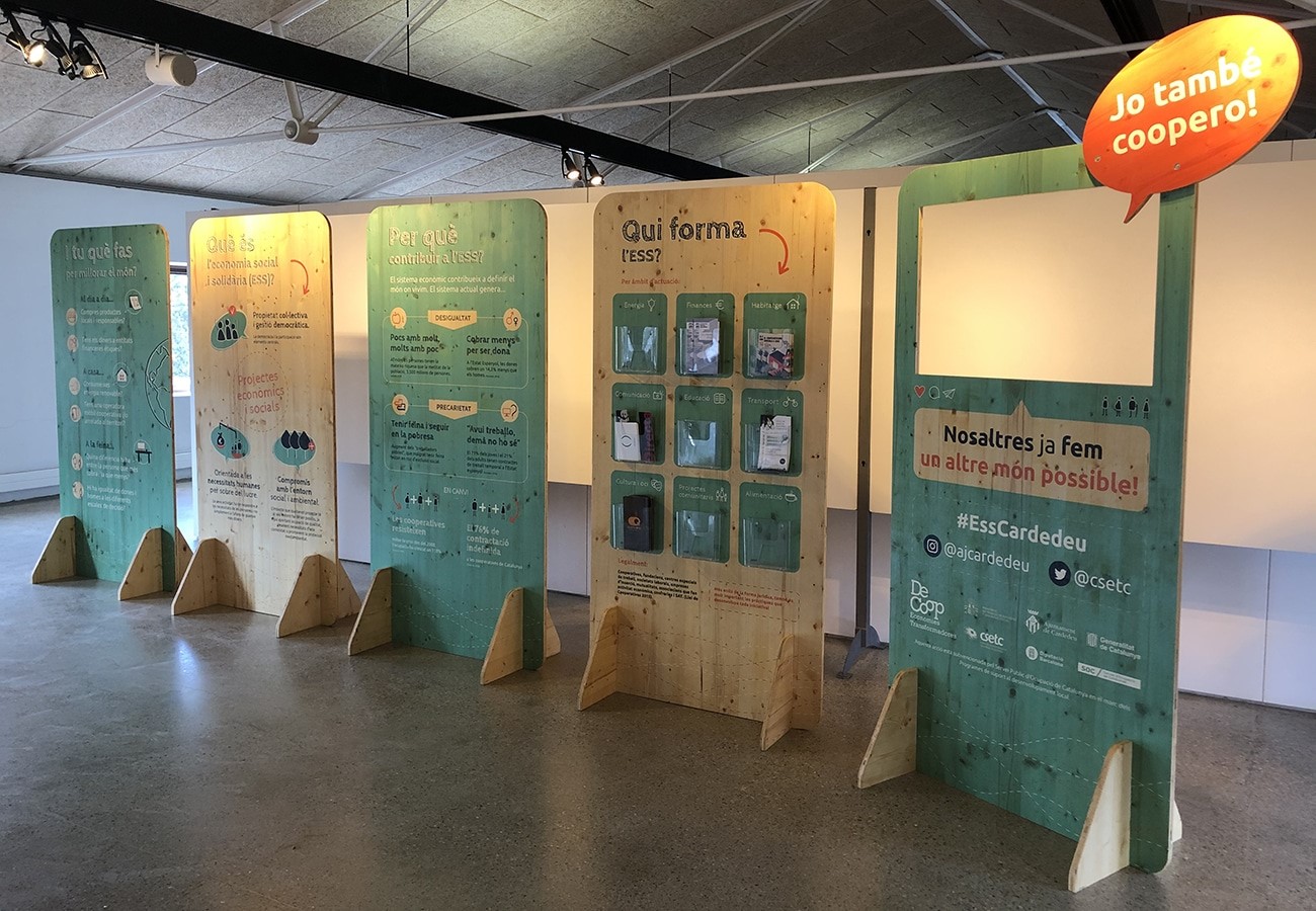 A l’equipament ja es poden veure dues exposicions programades en la quarta edició de la fira alTERna’t, que s’havia de celebrar el 27 de setembre però que finalment ha quedat suspesa per la situació sanitària que estem vivint. L’exposició “Què és l’economia social i solidària?”, cedida per l’Ajuntament de Cardedeu, explica a través de cinc plafons la importància i la presència en les nostres vides de l’economia social i solidària i del món cooperatiu en particular. Aquesta es podrà veure fins al 17 de setembre.