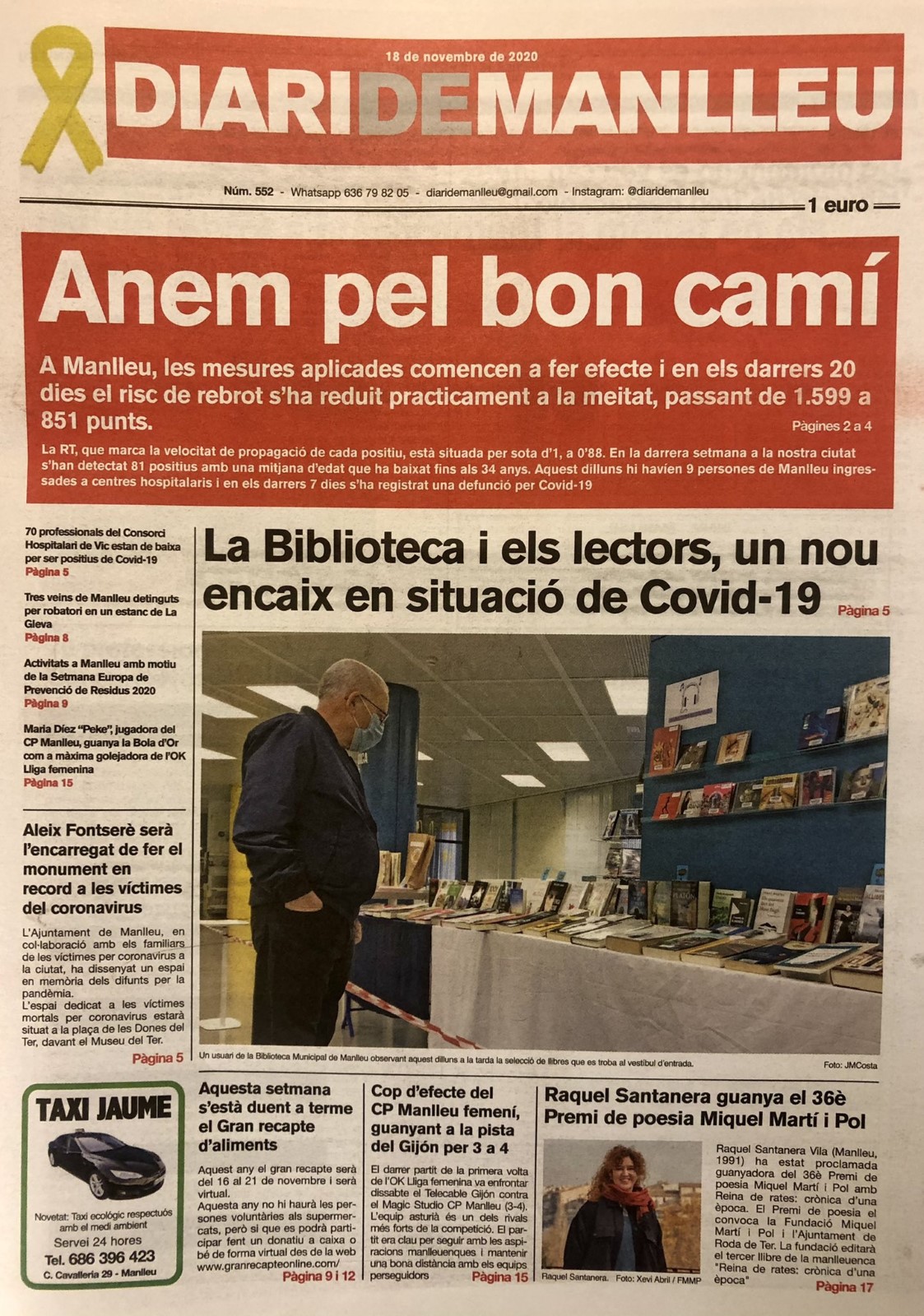 Aquesta és la portada del "Diari de Manlleu" d'avui dimecres, 18 de novembre del 2020.