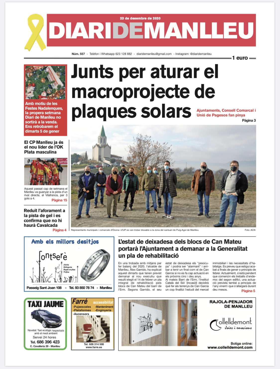 Aquesta és la portada del "Diari de Manlleu" d'avui dimecres, 23 de desembre del 2020.