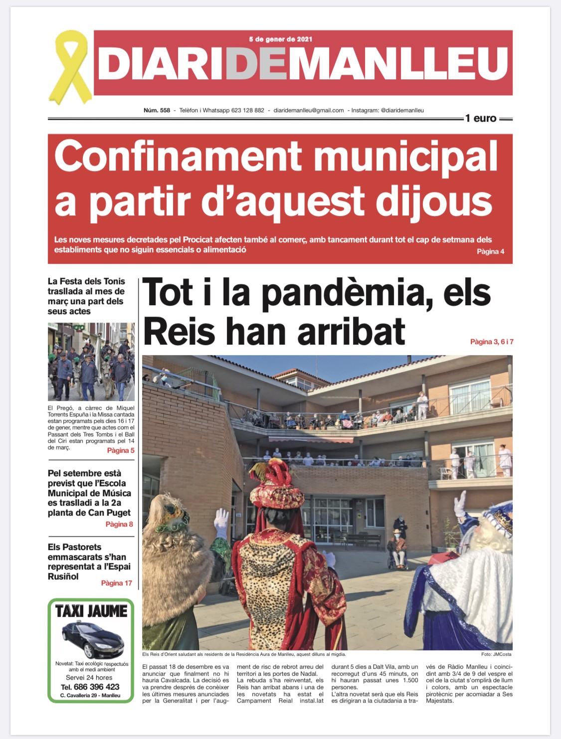 Aquesta és la portada del "Diari de Manlleu" d'avui dimarts, 5 de gener del 2021.