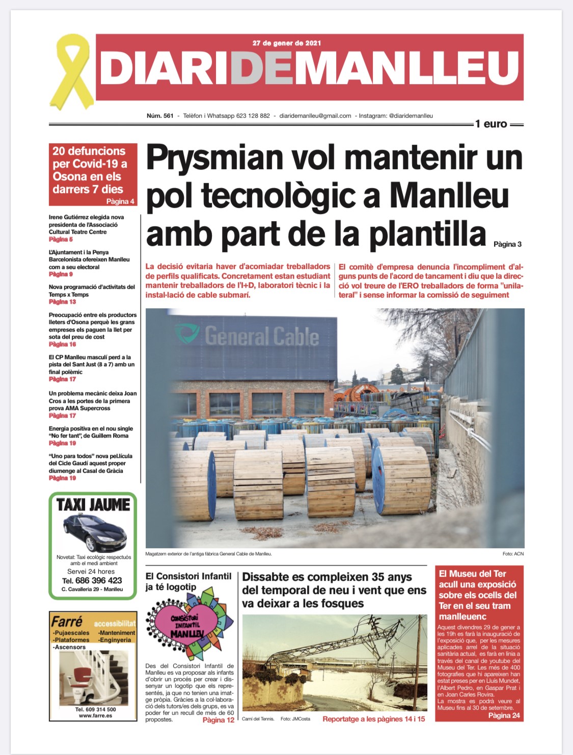 Aquesta és la portada del "Diari de Manlleu" d'avui dimecres, 27 de gener del 2021.