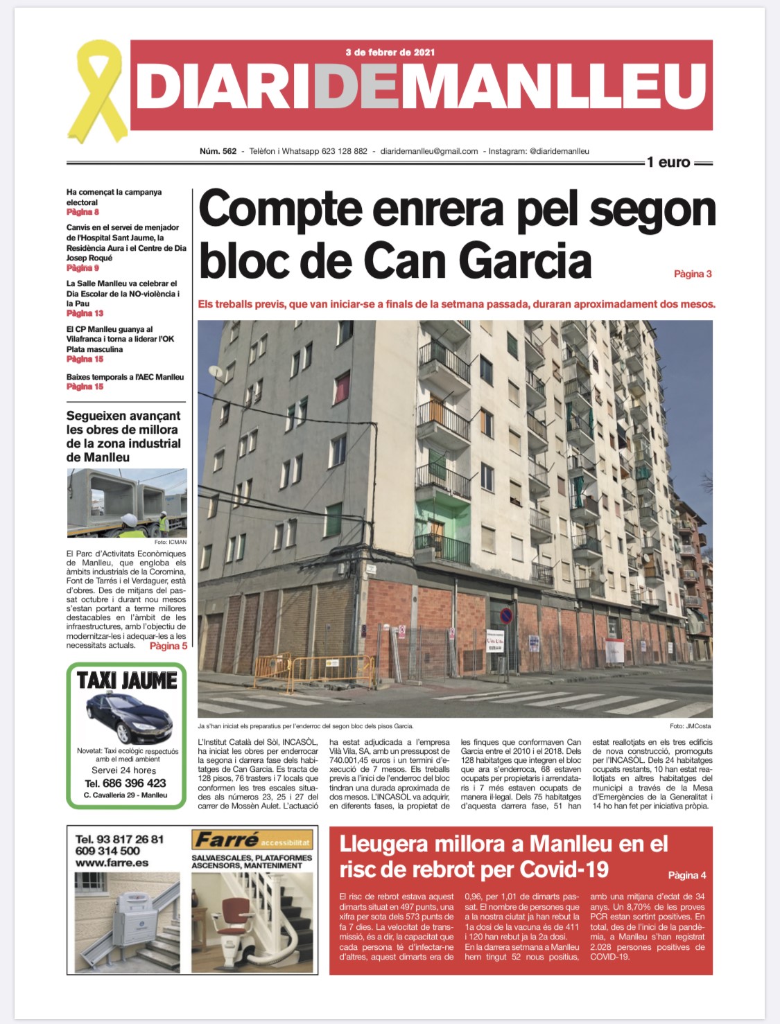 Aquesta és la portada del "Diari de Manlleu" d'avui dimecres, 3 de febrer del 2021.