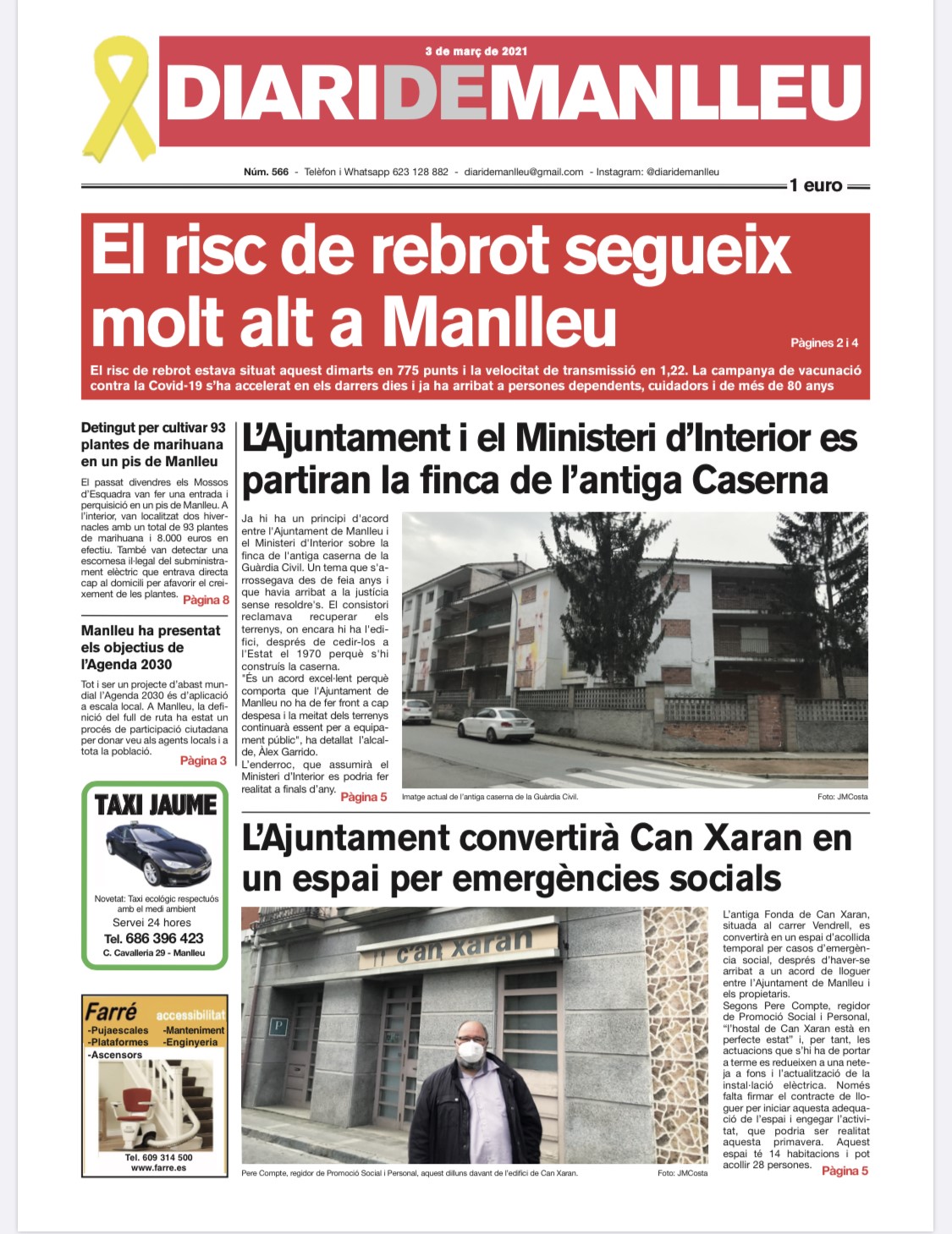 Aquesta és la portada del "Diari de Manlleu" d'avui dimecres, 3 de març del 2021.