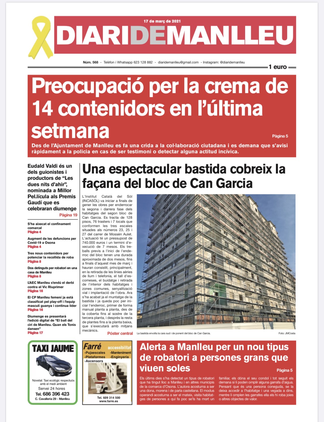 Aquesta és la portada del "Diari de Manlleu" d'avui dimecres, 17 de març del 2021.