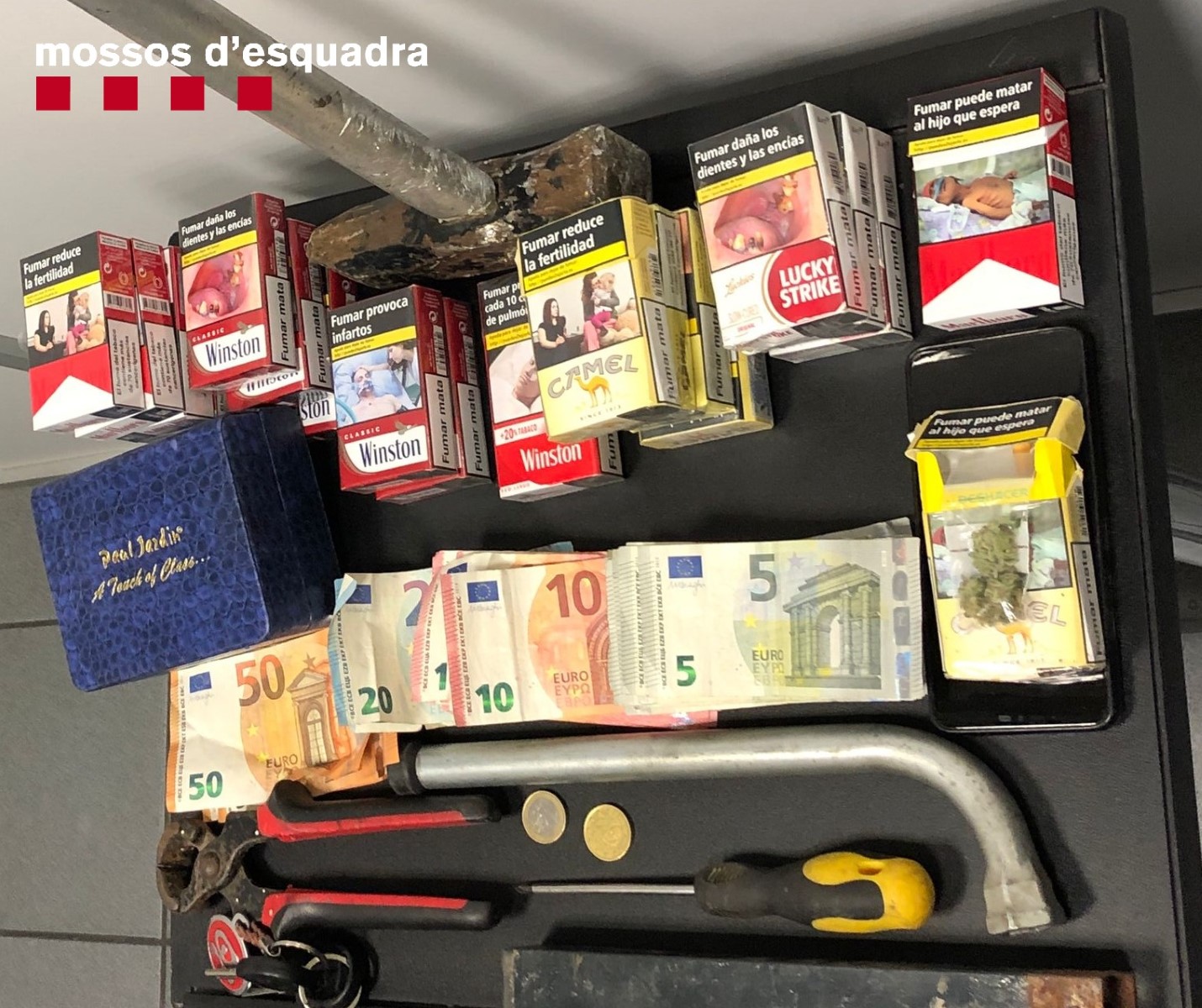 Durant l'escorcoll del vehicle van localitzar 18 paquets de tabac, 510 euros i diverses eines susceptibles de ser emprades per cometre robatoris. Els dos ocupants van quedar detinguts per la seva presumpta relació amb el robatori amb força. A més, el conductor va quedar investigat per un delicte contra la seguretat del trànsit, per conduir un vehicle a motor amb el permís retirat per pèrdua de tots els punts.