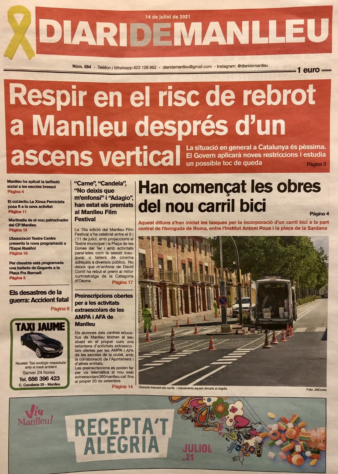 Aquesta és la portada del "Diari de Manlleu" d'avui dimecres, 14 de juliol del 2021.