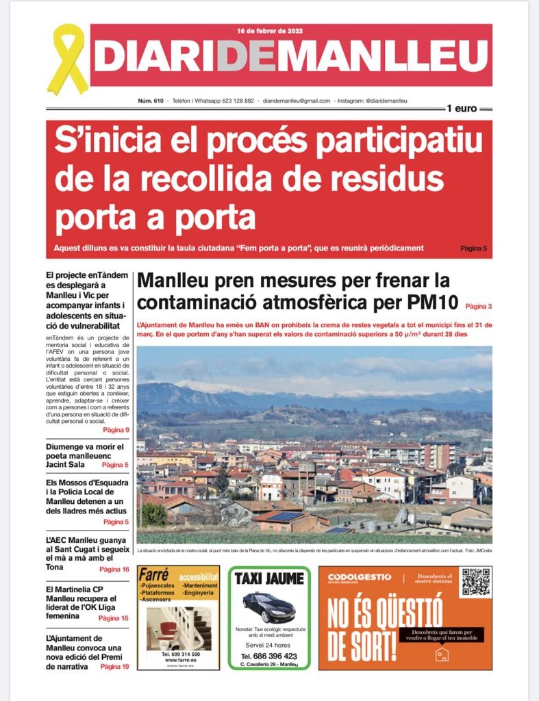 Aquesta és la portada del "Diari de Manlleu" d'avui dimecres, 16 de febrer del 2022.