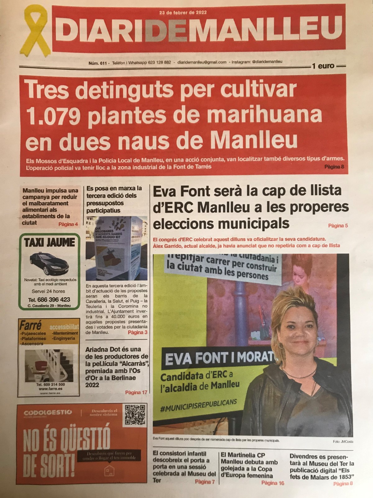 Aquesta és la portada del "Diari de Manlleu" d'avui dimecres, 23 de febrer del 2022.