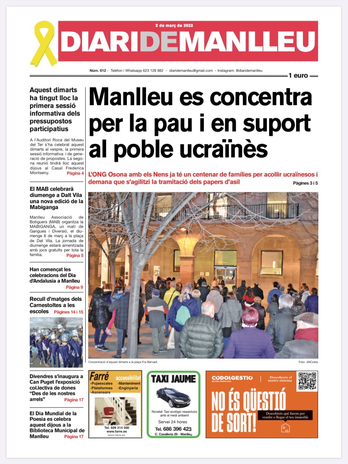 Aquesta és la portada del "Diari de Manlleu" d'avui dimecres, 2 de març del 2022.
