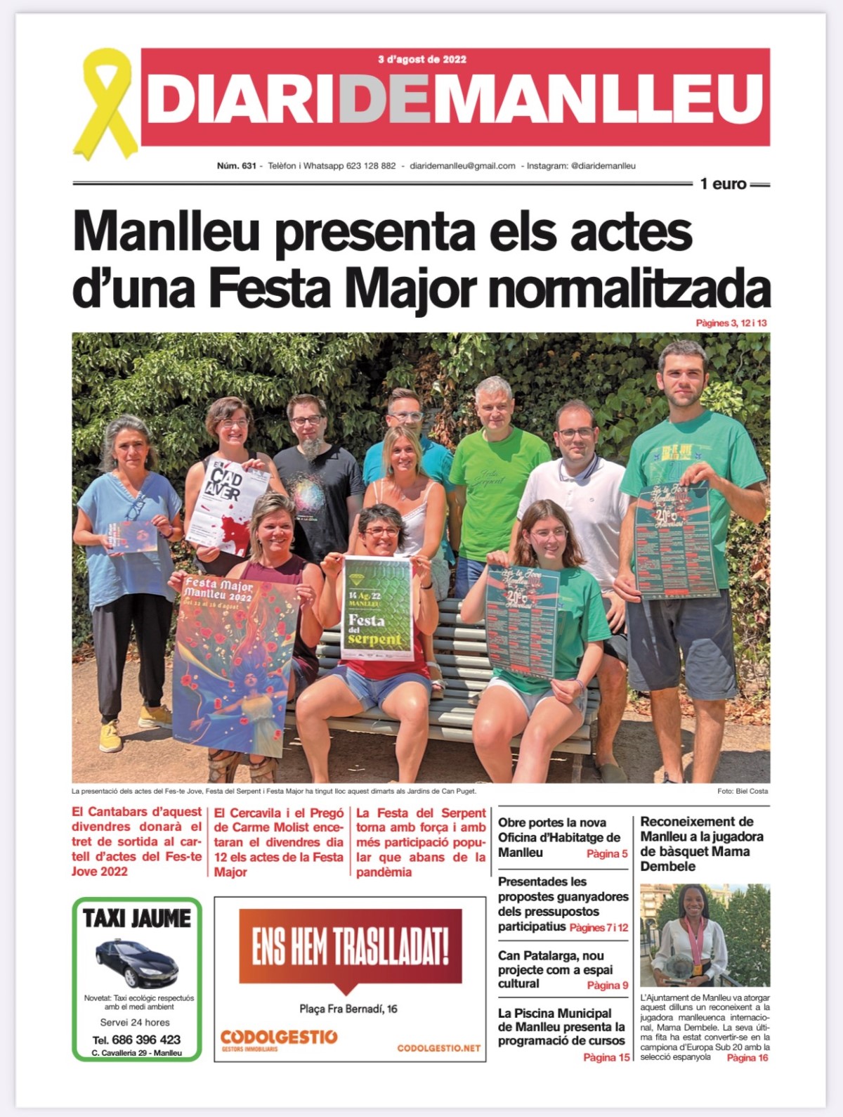 Aquesta és la portada del “Diari de Manlleu” d’avui dimecres, 3 d'agost del 2022. El número 631 de la publicació setmanal destaca la presentació de la Festa Major de Manlleu, el reconeixement de l'Ajuntament de Manlleu a la jugadora de bàsquet, Mama Dembele, i les propostes guanyadores dels pressupostos participatius.