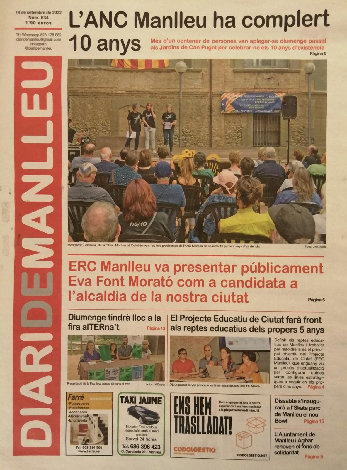 Aquesta és la portada del "Diari de Manlleu" d'avui dimecres, 14 de setembre del 2022.