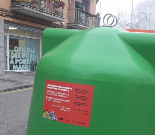 Es col·loquen vinils als contenidors de vidre, on actualment es troben bosses de deixalles abandonades a terra. En aquests cartells s'informa de la prohibició d'abandonar residus al carrer i que això pot comportar multes de fins a 3.000 euros. A més, es posen cartells a les bústies comunitàries que indiquen la franja horària en què cal deixar les bosses de deixalles al carrer.