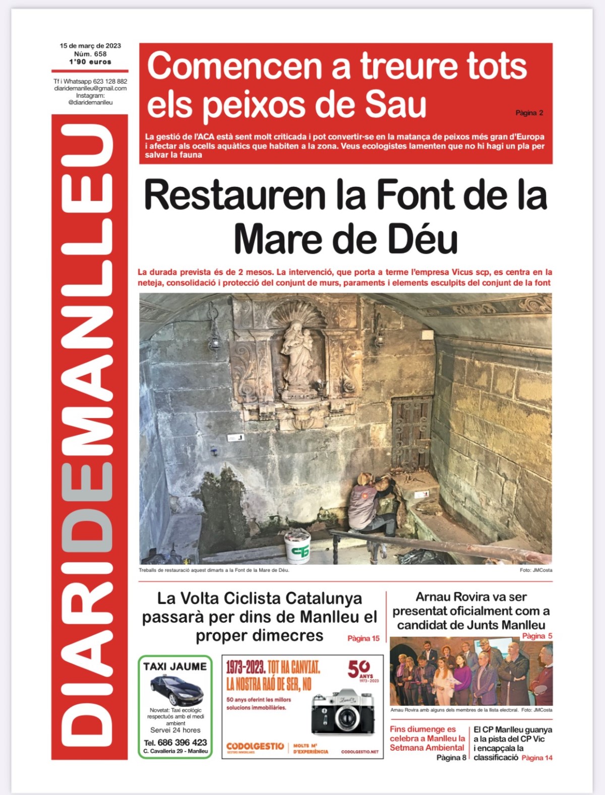 Aquesta és la portada del "Diari de Manlleu" d'avui dimecres, 15 de març del 2023.