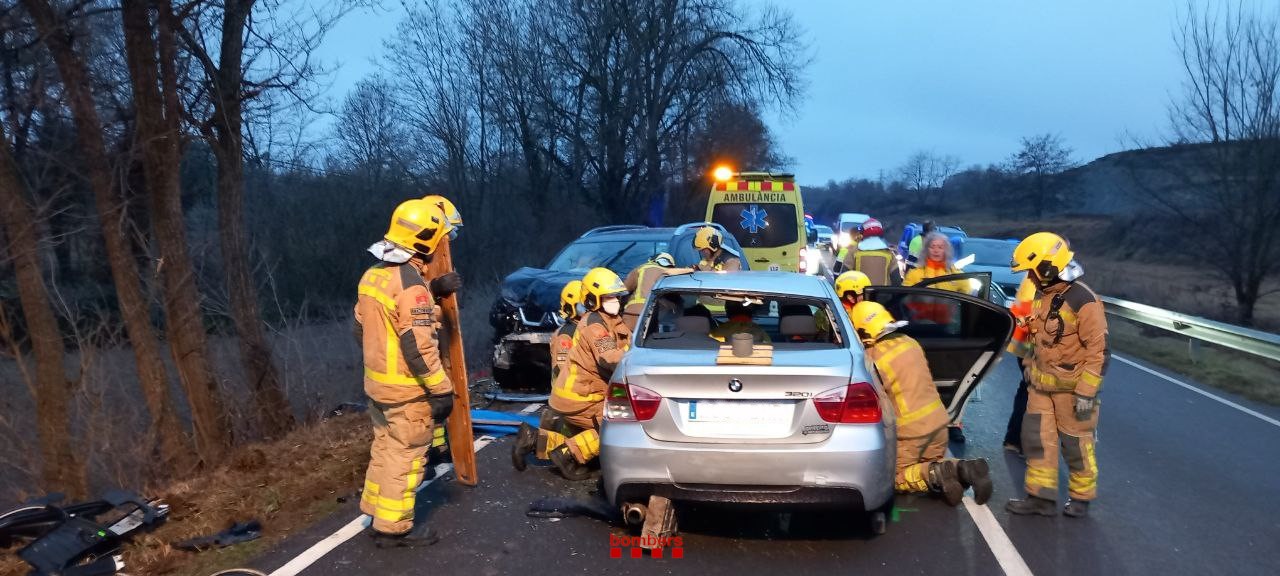 Dos turismes han xocat i els Bombers han informat que han hagut de fer l’extracció del conductor d’un dels vehicles implicats en el sinistre. Dues persones han resultat ferides i han estat ateses pels serveis d’emergència.