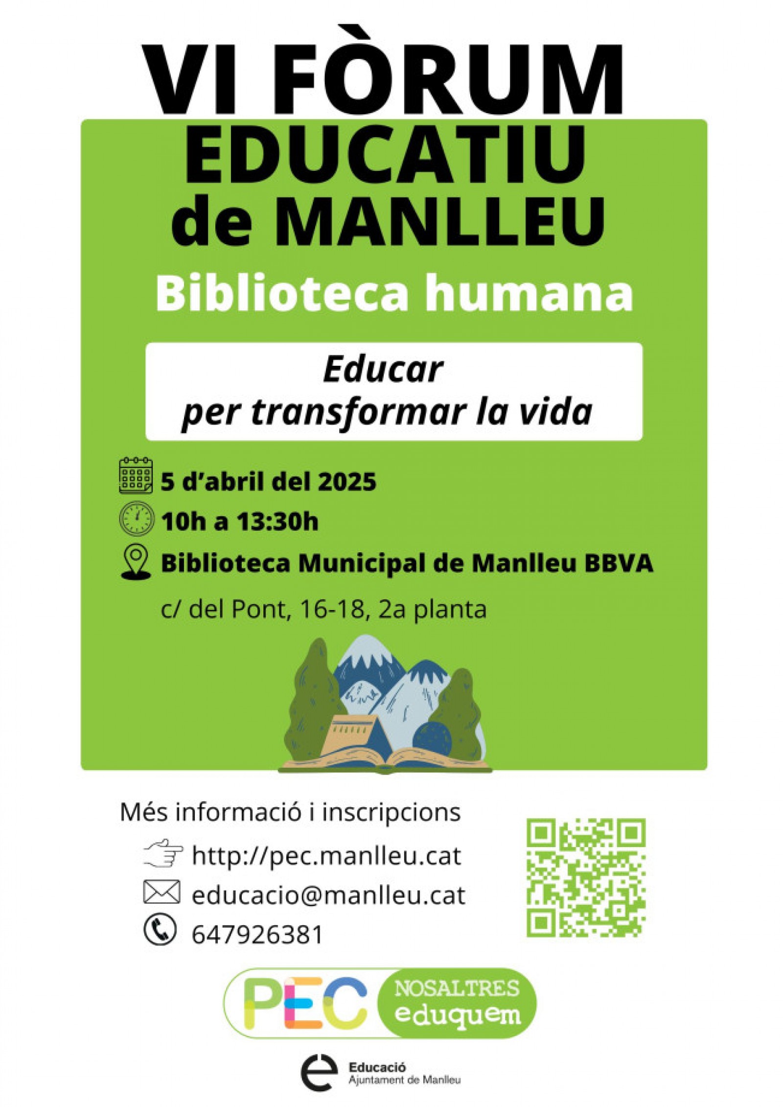 Biblioteca humana, protagonitzada en primera persona per manlleuencs i manlleuenques que han viscut un procés transformador a través de l’educació. Aquest format, nascut a Dinamarca l’any 2000, s’ha expandit a més de 80 països i permetrà llegir l’experiència de vuit persones de diferents àmbits per donar peu a un espai de reflexió i treball.