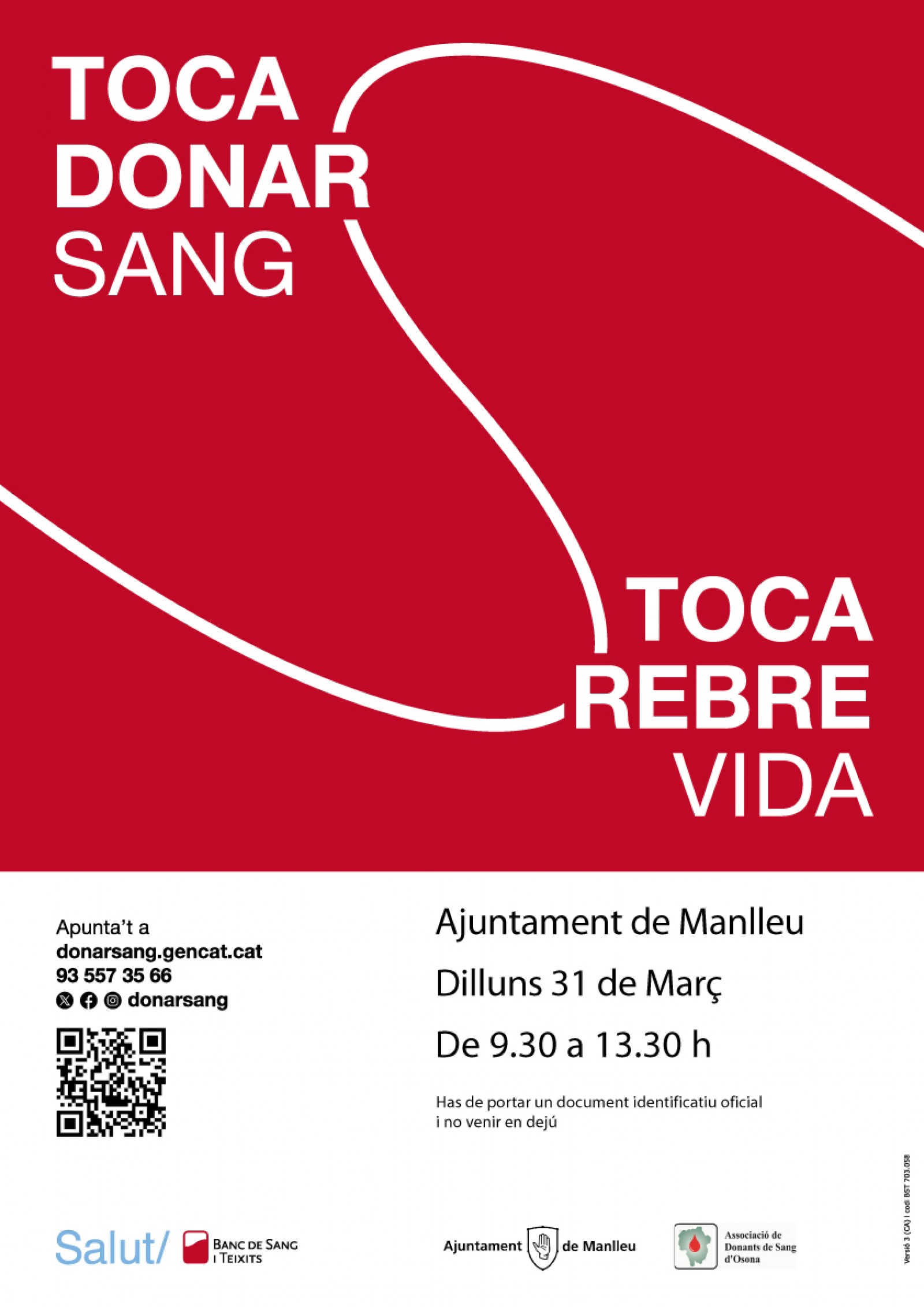 Des de l'Ajuntament de Manlleu, l'Associació de donants de sang d'Osona i el Banc de Sang s'anima als veïns i veïnes de Manlleu a donar sang. Per fer-ho, cal inscriure’s a la