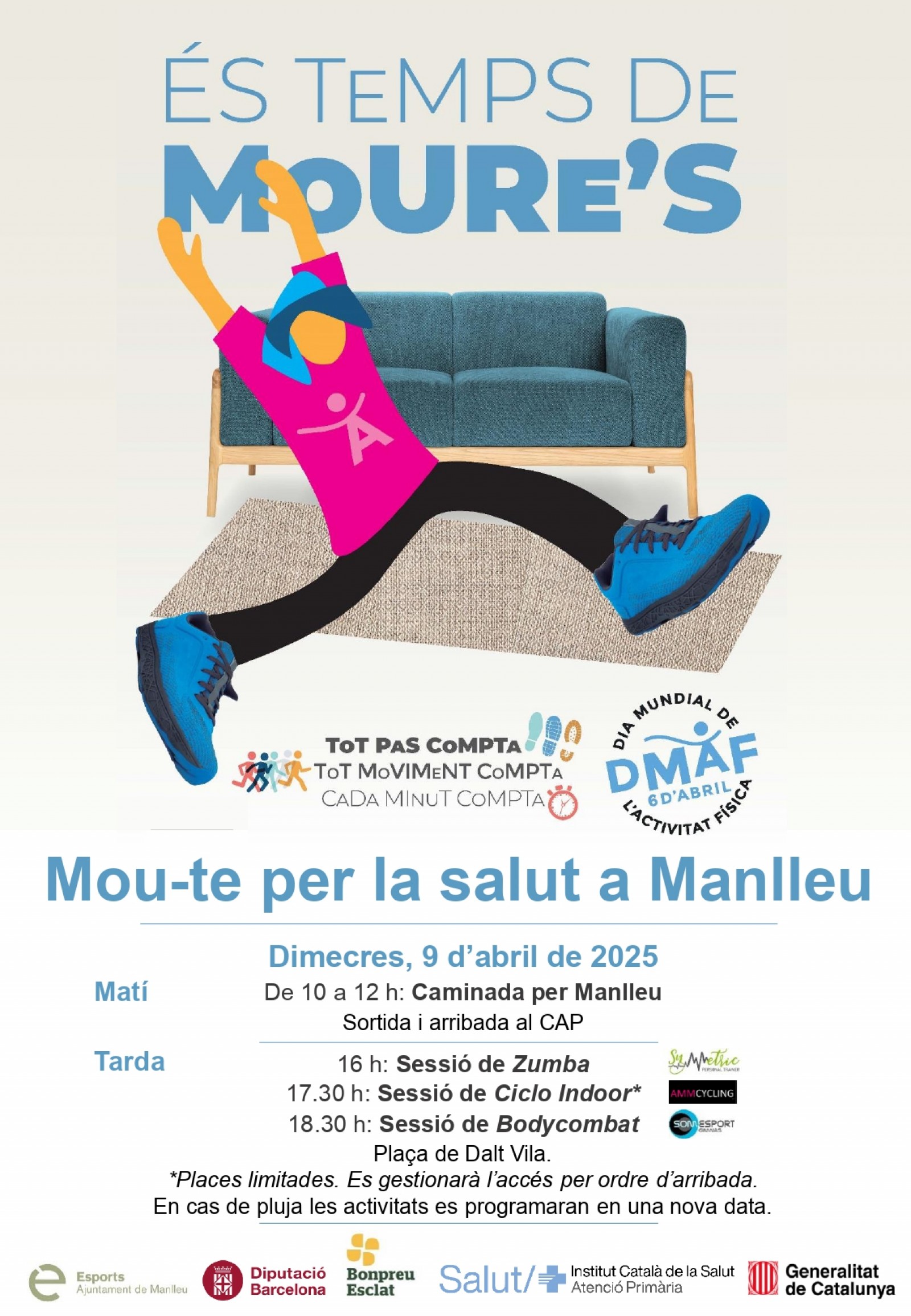 Les activitats que s’han organitzat a Manlleu amb motiu del Dia Mundial de l'Activitat Física seran el dia 9 d’abril. En cas de pluja, les activitats es programaran en una nova data.