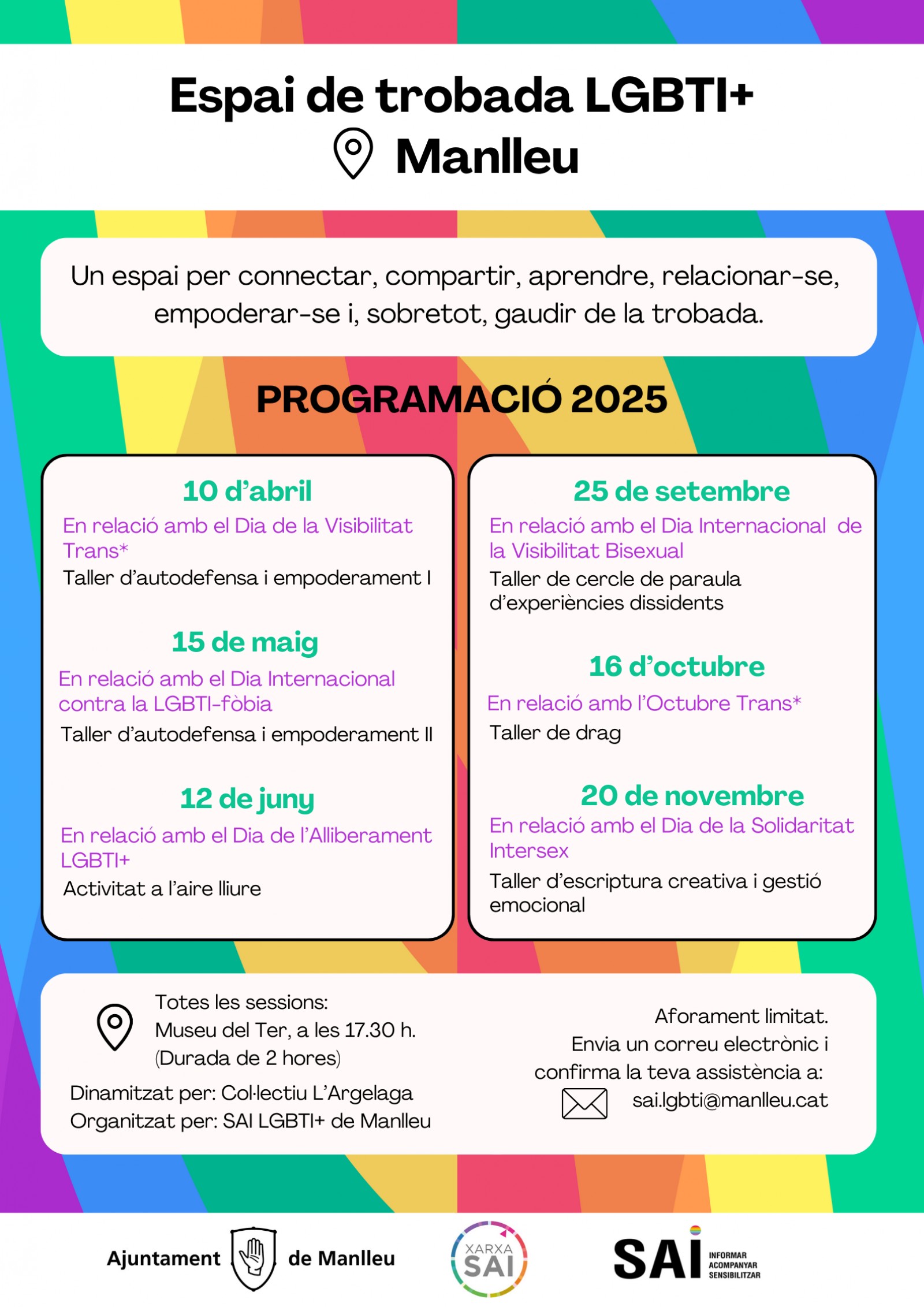 El Servei d'Atenció Integral (SAI) de l'juntament de Manlleu, ha organitzat un espai de trobada pel col·lectiu LGBTI+. Per aquest 2025, s'han programat 6 sessions de 2 hores que tindran lloc al Museu del Ter.