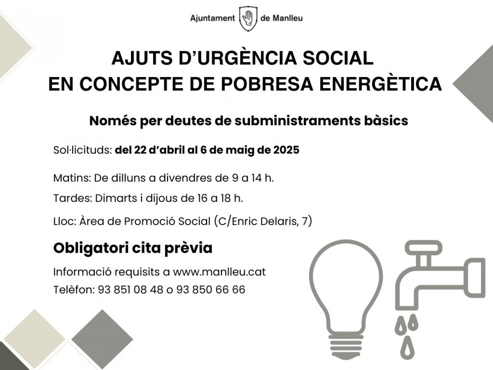 Per a més informació dels ajuts i per sol·licitar cita prèvia podeu fer-ho trucant al 93 8506666 o bé al 93 8510848.