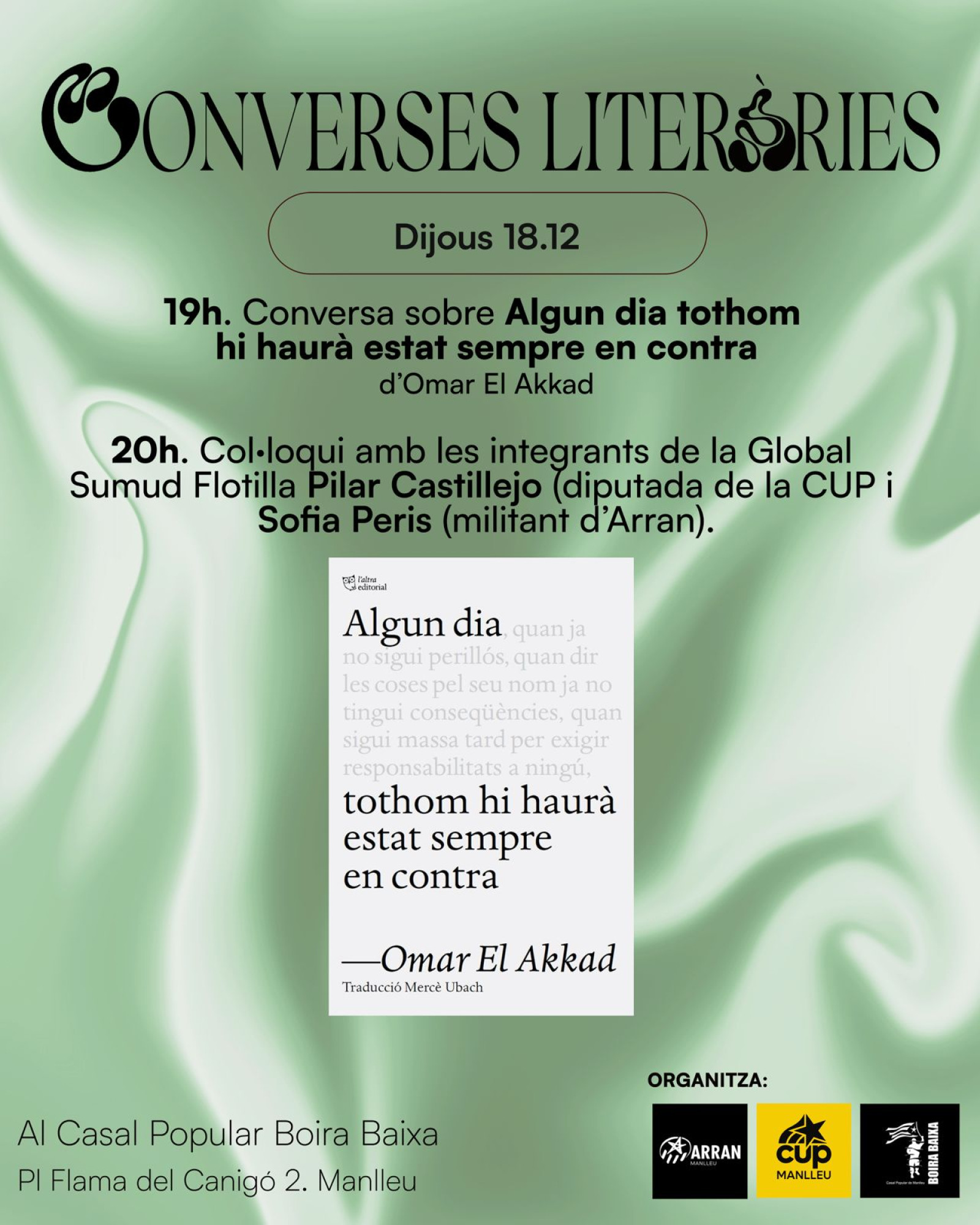 Tot seguit, les integrants de la Global Sumud Flotilla Pilar Castillejo (diputada de la CUP al Parlament de Catalunya) i Sofia Peris (militant d’Arran) compartiran la seva experiència en un col·loqui obert organitzat per l’Esquerra Independentista de Manlleu.