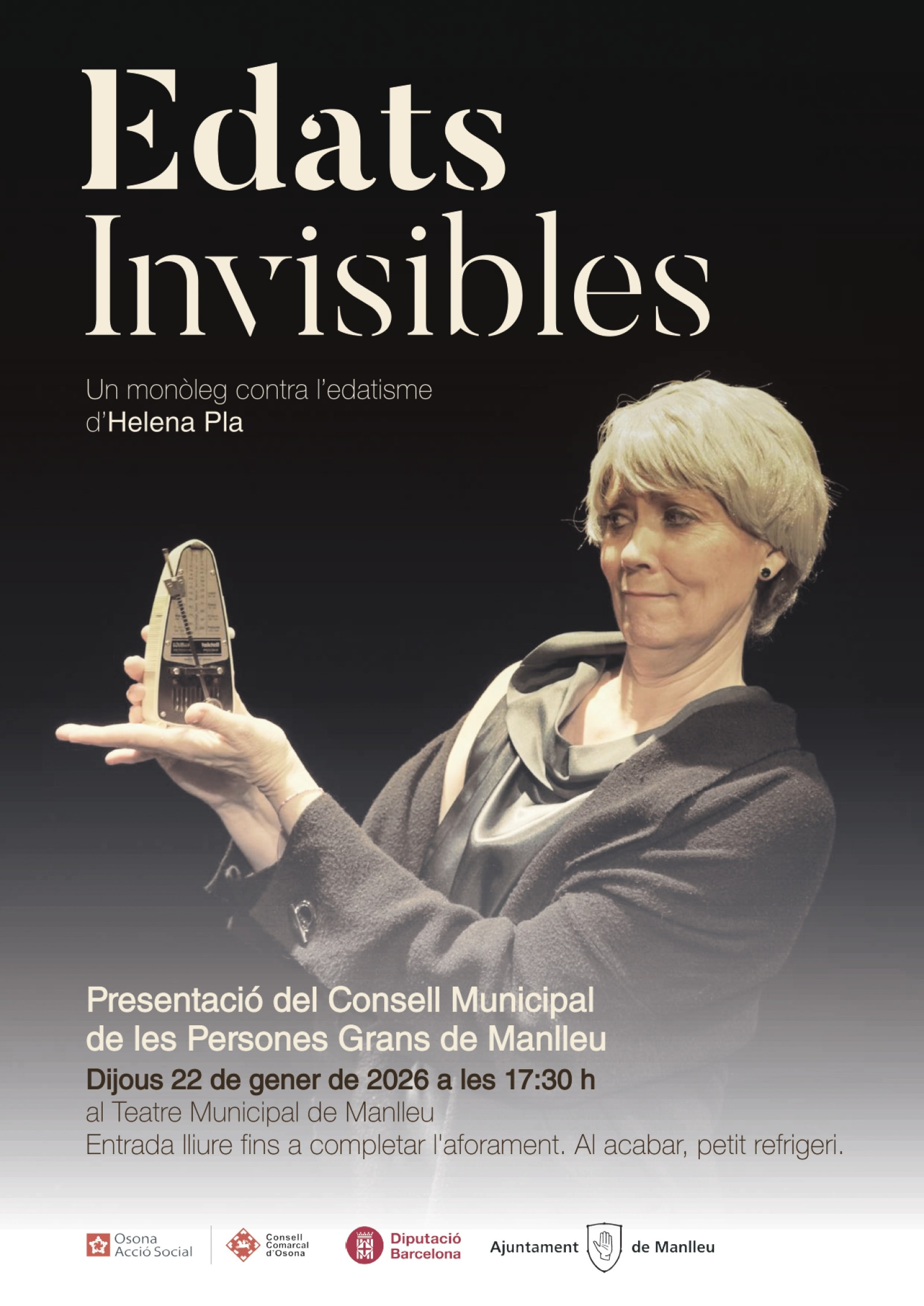presentació del Consell de les persones grans de Manlleu, un òrgan participatiu i consultiu per treballar les polítiques municipals associades a l’envelliment. La presentació anirà a càrrec de l’alcalde Arnau Rovira i la regidora Núria Roura. A continuació, es representarà el monòleg