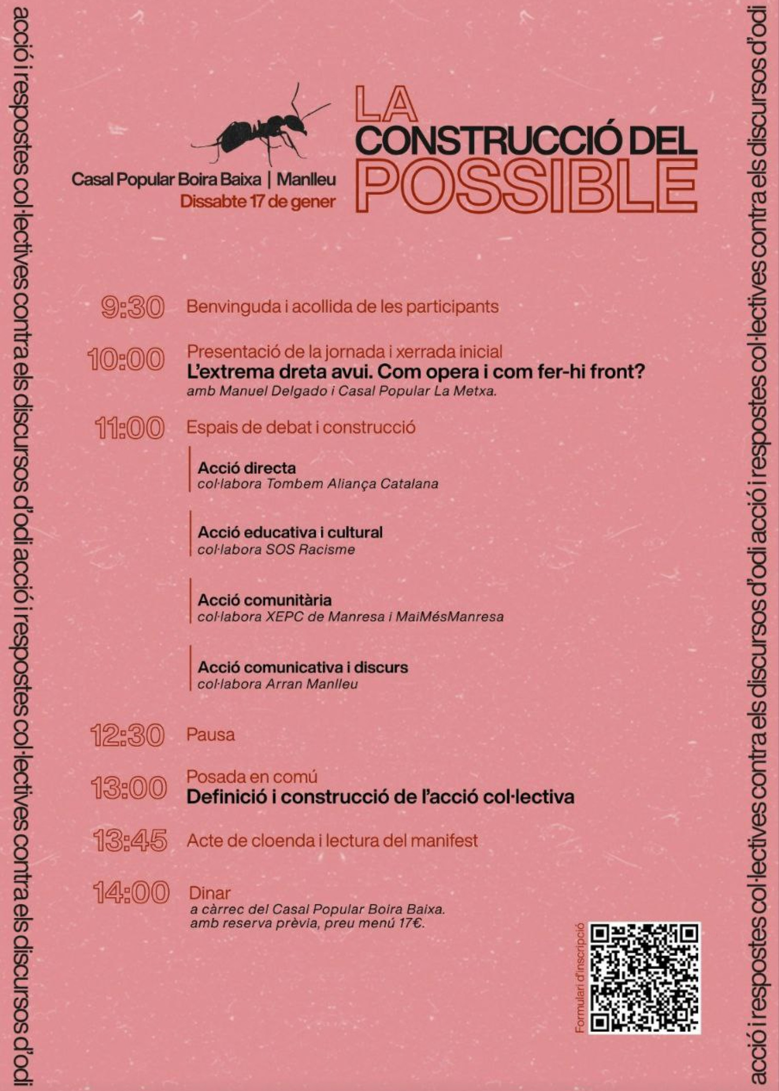 La construcció del possible, centrada en l’acció i les respostes col·lectives als discursos d’odi de l'extrema dreta. Participen en la seva organització diversos col·lectius i entitats d'Osona i el Lluçanès.