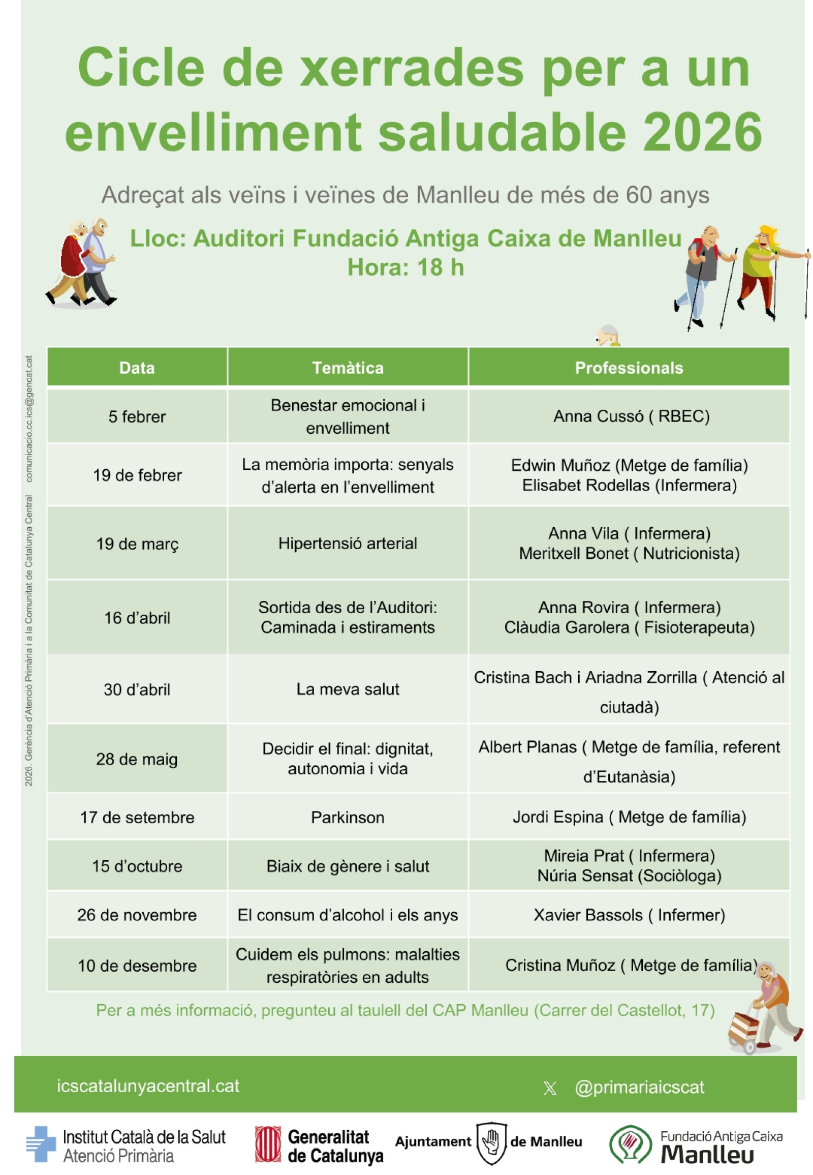 El Cicle de xerrades per a un envelliment saludable 2026, està adreçat als veïns i veïnes de Manlleu de més de 60 anys. Cada mes, especialistes parlaran sobre un tema a l'Auditori Fundació Antiga Caixa de Manlleu. Les inscripcions per a les activitats es poden fer al CAP de Manlleu. La pròxima xerrada tindrà lloc el 19 de març i tractarà sobre la hipertensió arterial.