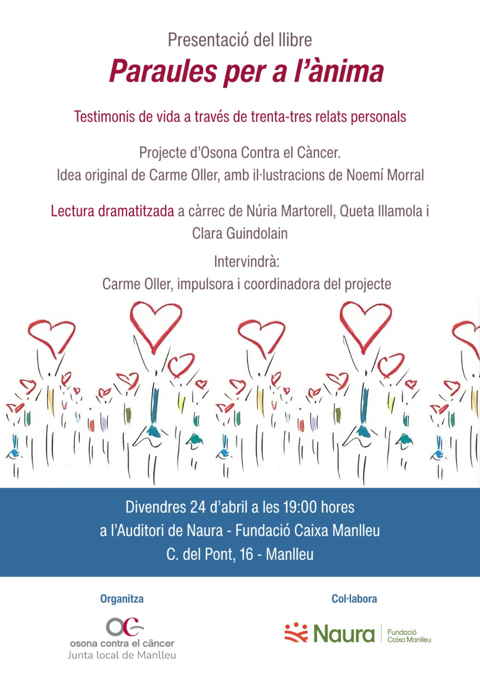 La presentació de Paraules per a l’ànima està organitzada per Osona Contra el Càncer – Junta local de Manlleu i compta amb la col·laboració de Naura - Fundació Caixa Manlleu.