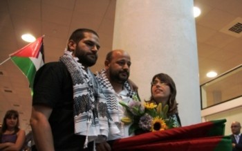 Els cooperants propalestins David Segarra, Manuel Tapial i Laura Arau, en la seva arribada a l'aeroport de Barcelona