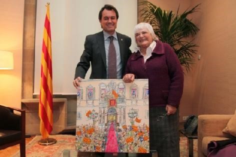 ACN - La dibuixant Pilarín Bayés ha entregat aquest dilluns a la tarda un quadre al president de la Generalitat, Artur Mas, que il·lustra el dia que va prendre possessió del càrrec al Palau de la Generalitat el passat mes de desembre.