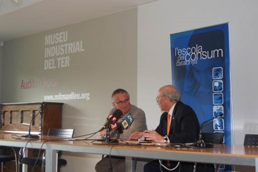 Pere Prat i Alfons Conesa presentant l'Escola del Consum a Manlleu