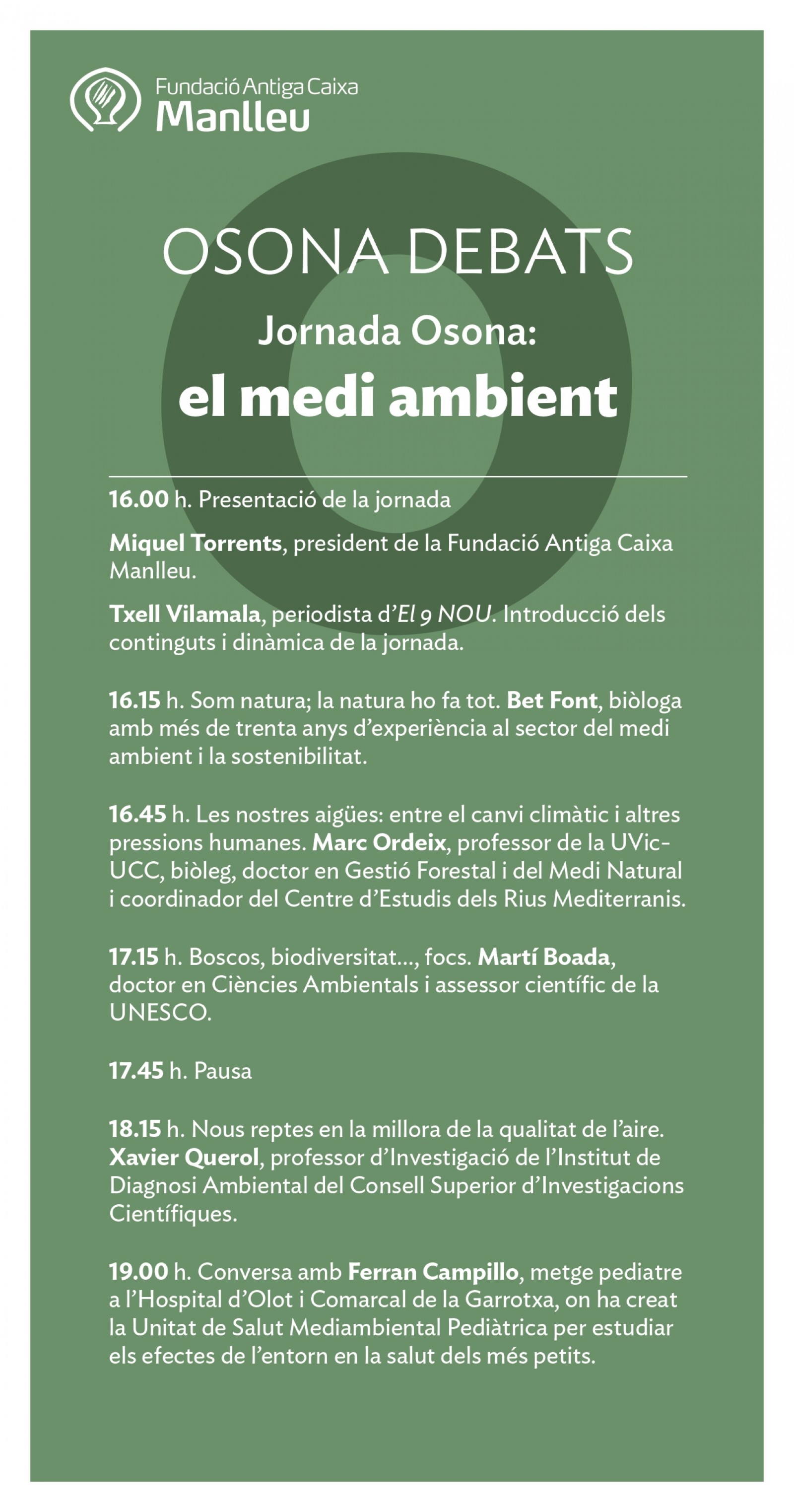cinc destacats experts en la matèria; Bet Font, Marc Ordeix, Martí Boada, Xavier Querol i Ferran Campillo, que parlaran de temes com la qualitat de l'aire, l'estat de l'aigua, el perill d'incendis o l'impacte de les infraestructures.