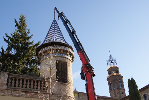 Manlleu ha començat avui la recuperació de les punxes de les torretes de Can Vilaró, un cop es va arribar a un acord amb els propietaris de la finca. Aquest dimarts al matí sha col·locat la primera de les teulades de les torretes, i es preveu que divendres que ve, just el dia de lestrena de la plaça Fra Bernadí, sinstal·larà la segona.