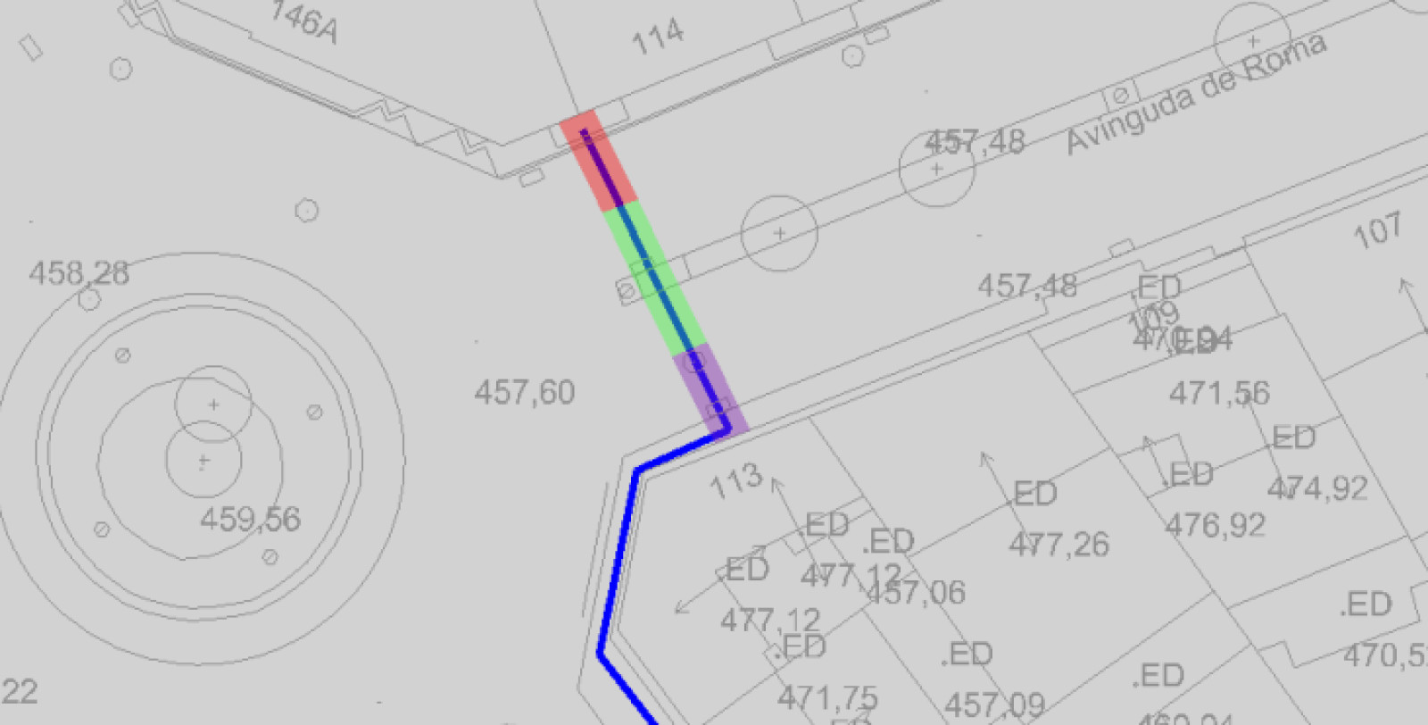 L'actuació es dividirà en tres trams. El primer tram (color lila) anirà des de la vorera sud de l'avinguda fins a la meitat de la calçada del primer carril. El segon tram (color verd) es realitzarà des de la meitat de la calçada del primer carril fins a la meitat de la calçada del segon carril, i el darrer tram (color vermell) és el que va des de la meitat de la calçada del segon carril fins a la vorera nord de l'avinguda.